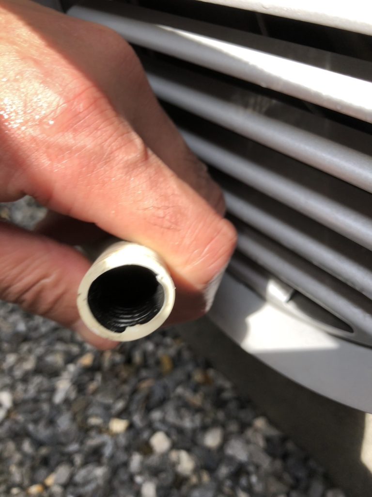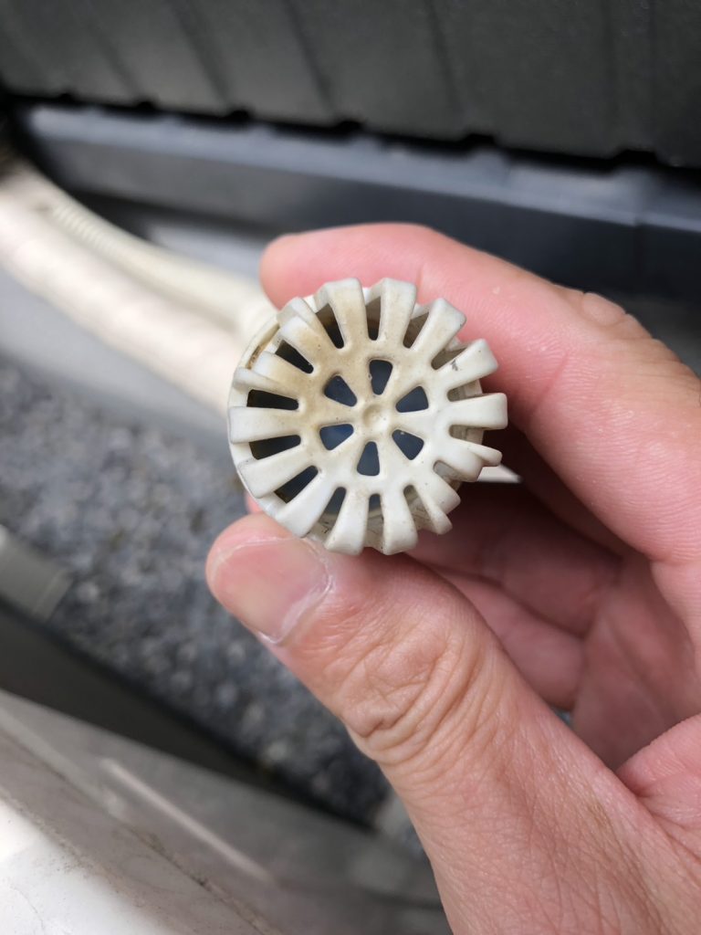 ドレンホース(排水管)のゴミの詰まりです。画像のように防虫キャップを付けていると確率が高くなるので付けているご家庭は小まめに外して清掃をしましょう!!掃除をしてきれいになり、エアコンからの水漏れも改善しました!!(清掃前の画像は控えておきます)