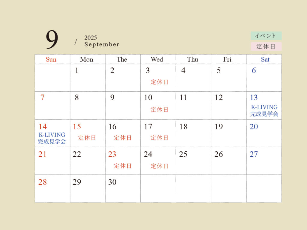 Blog 2025年9月営業日のお知らせです。 ●月1回の火曜定休日は9/16(火)となります。 随時リノベーションモデル見学会やセミナーを開催しています。お気軽にお問い合わせください。 →イベント情報はこちら 他の記事 […]