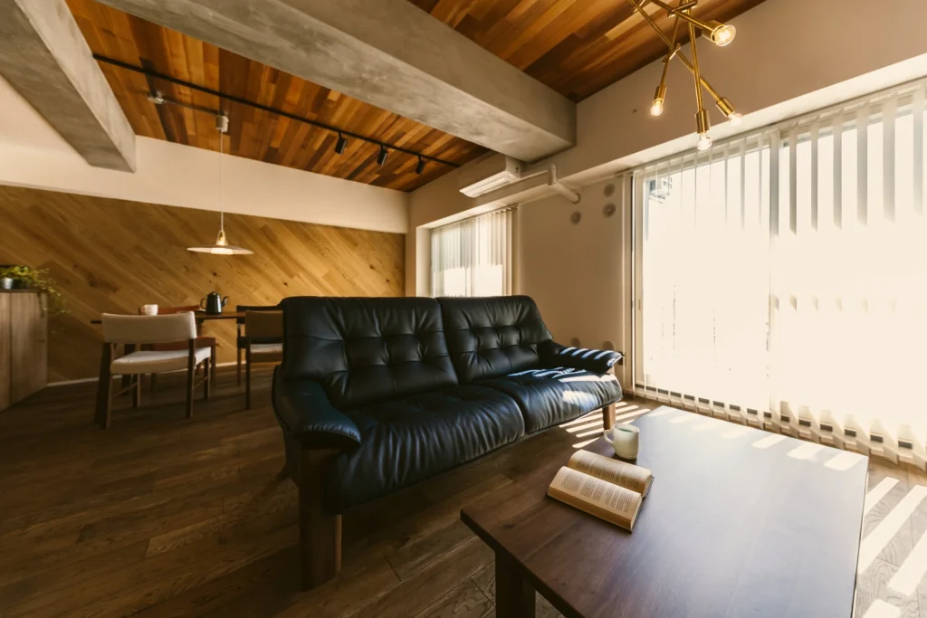 築年数を感じさせない、開放感あふれるLDKです。高い天井と木の素材が、温かみと開放感を演出しています。コンクリートと照明の組み合わせが、スタイリッシュなアクセントになっています。リビングスペースとダイニングスペースがゆるやかにつながる快適空間です。