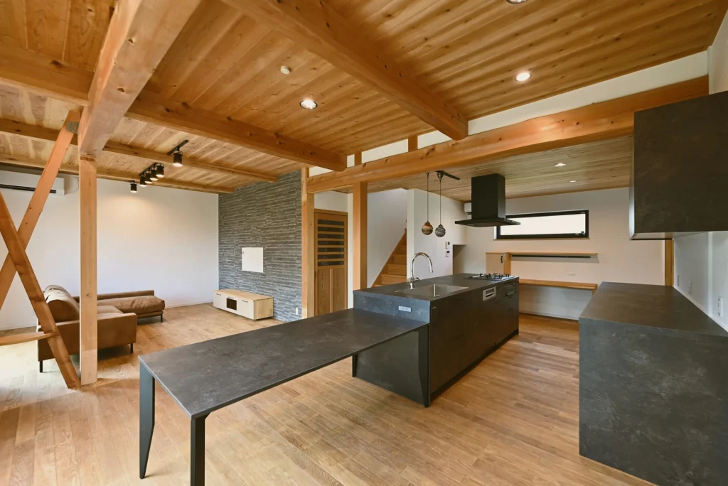 家族みんなが自然と集まる、心地よいリビング空間開放感のある高い天井と、木の温もりを感じさせる内装が特徴的です。キッチンは、モダンなデザインのアイランドキッチンで、機能性も抜群です。リビング・ダイニングは、大きな窓から光が差し込み、明るい空間となっています。