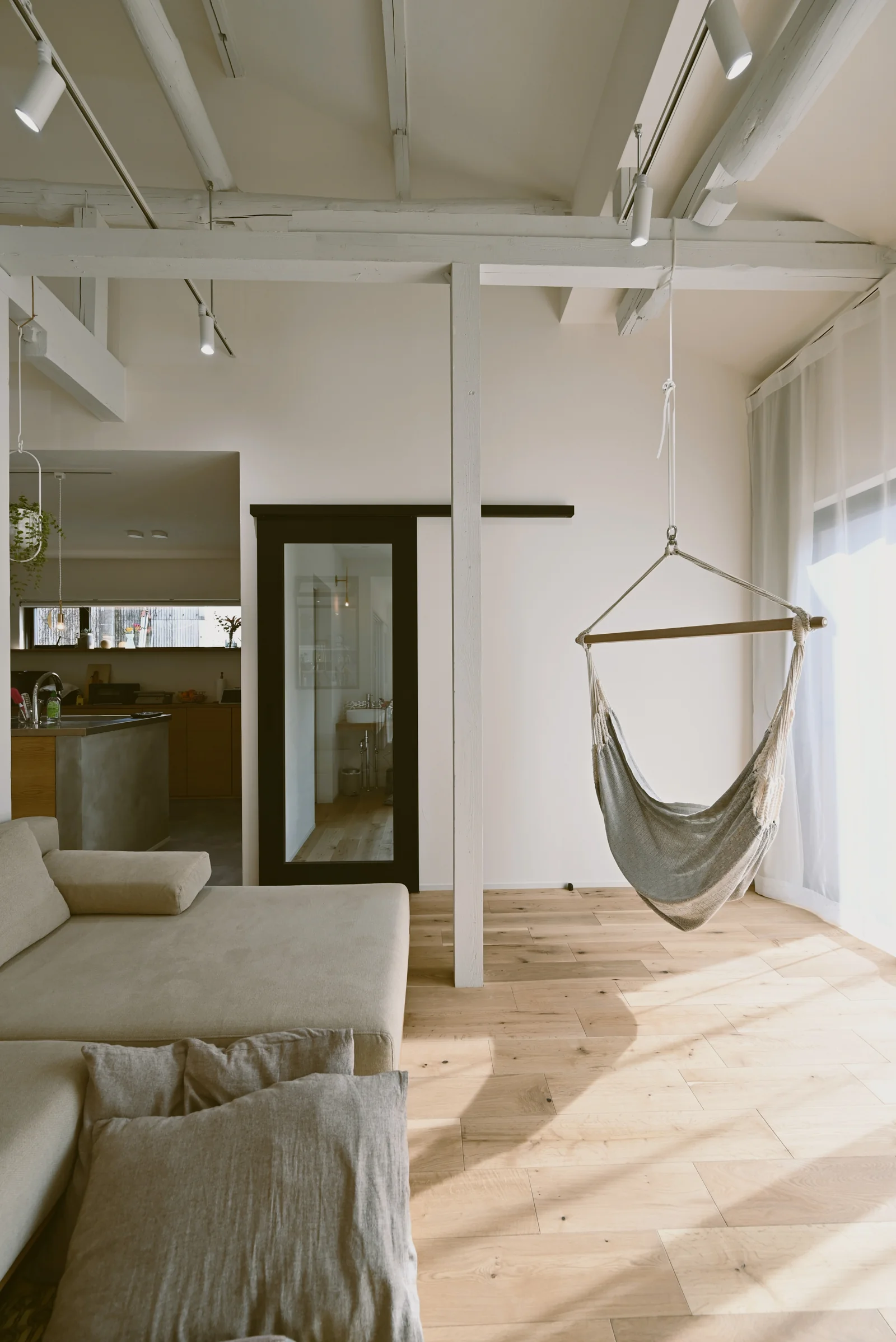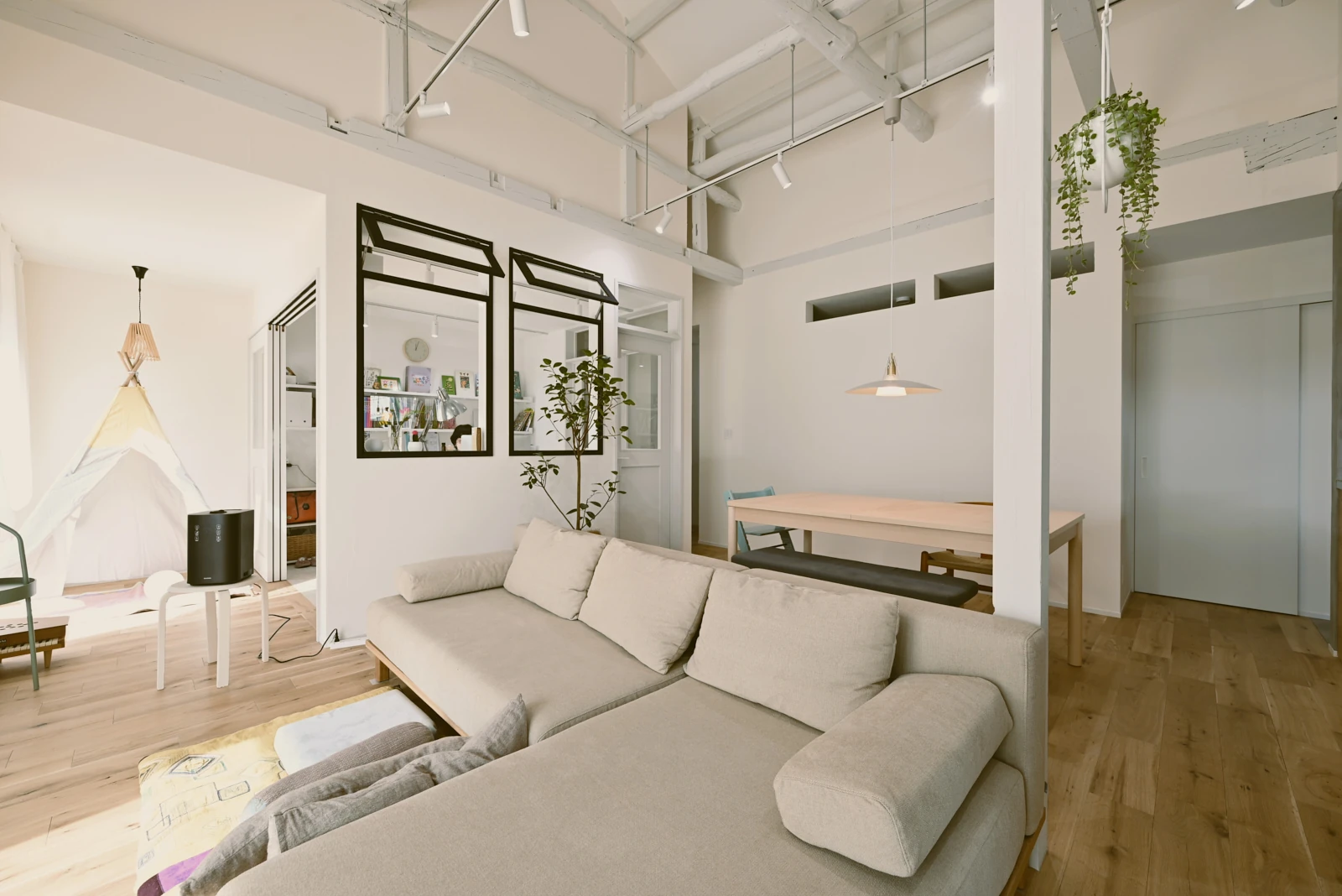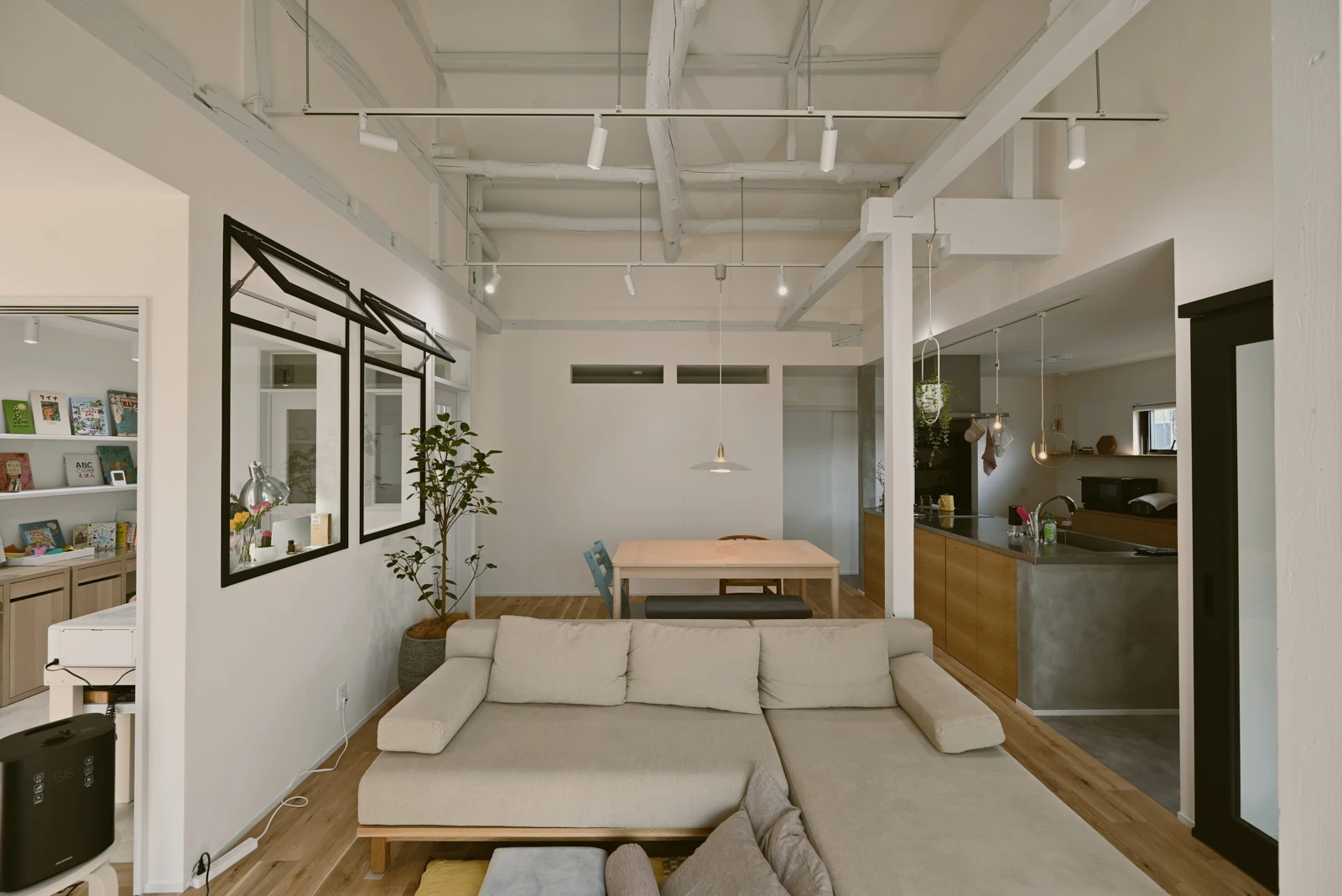 白い壁と高い天井が、開放感と明るさを生み出し、黒いフレームのドアが印象的で空間を引き締めています。床や梁、家具などに木が使われており、温かみのある空間になります。観葉植物を配置することで、癒やしを与えてくれます。