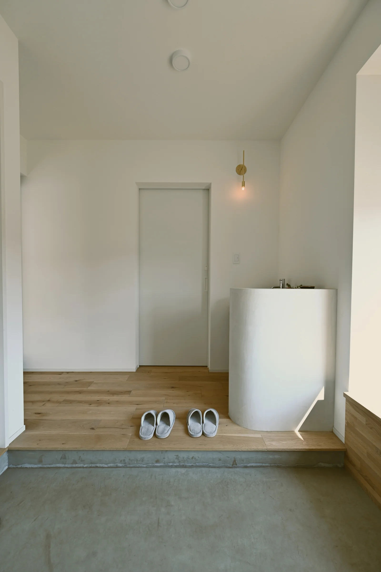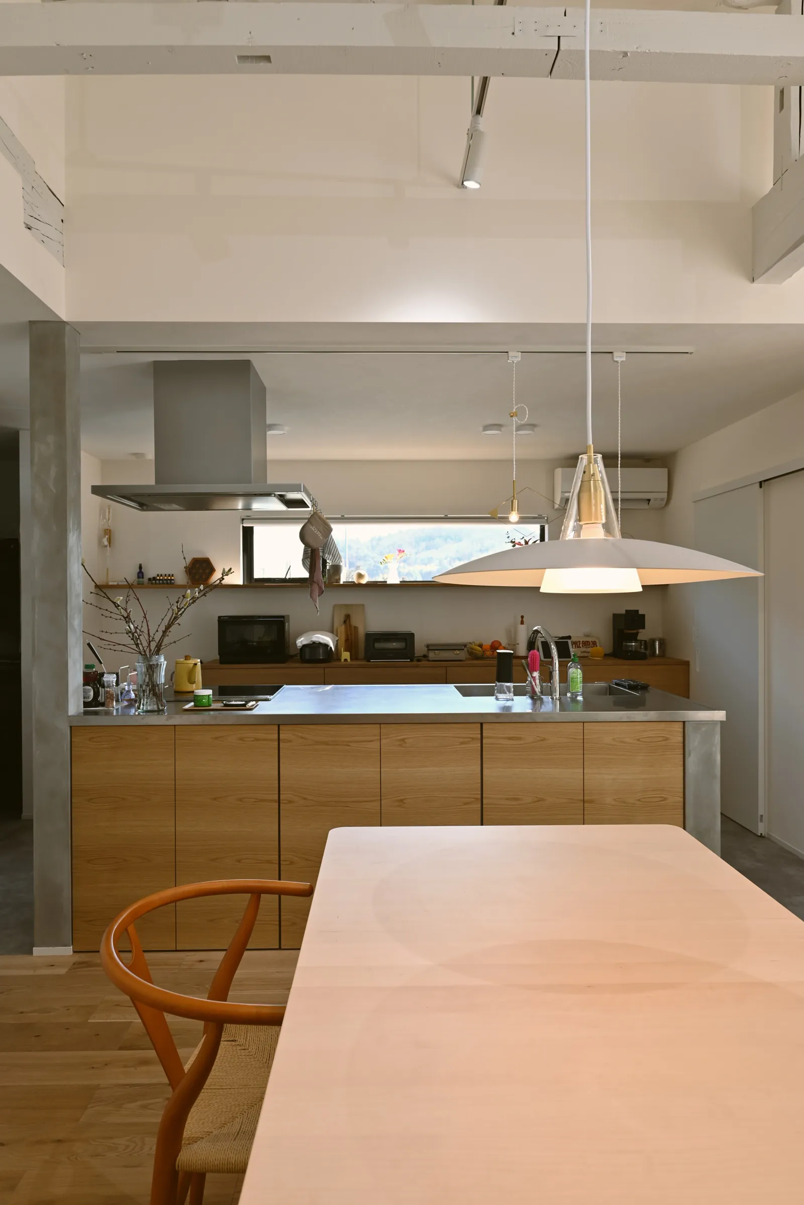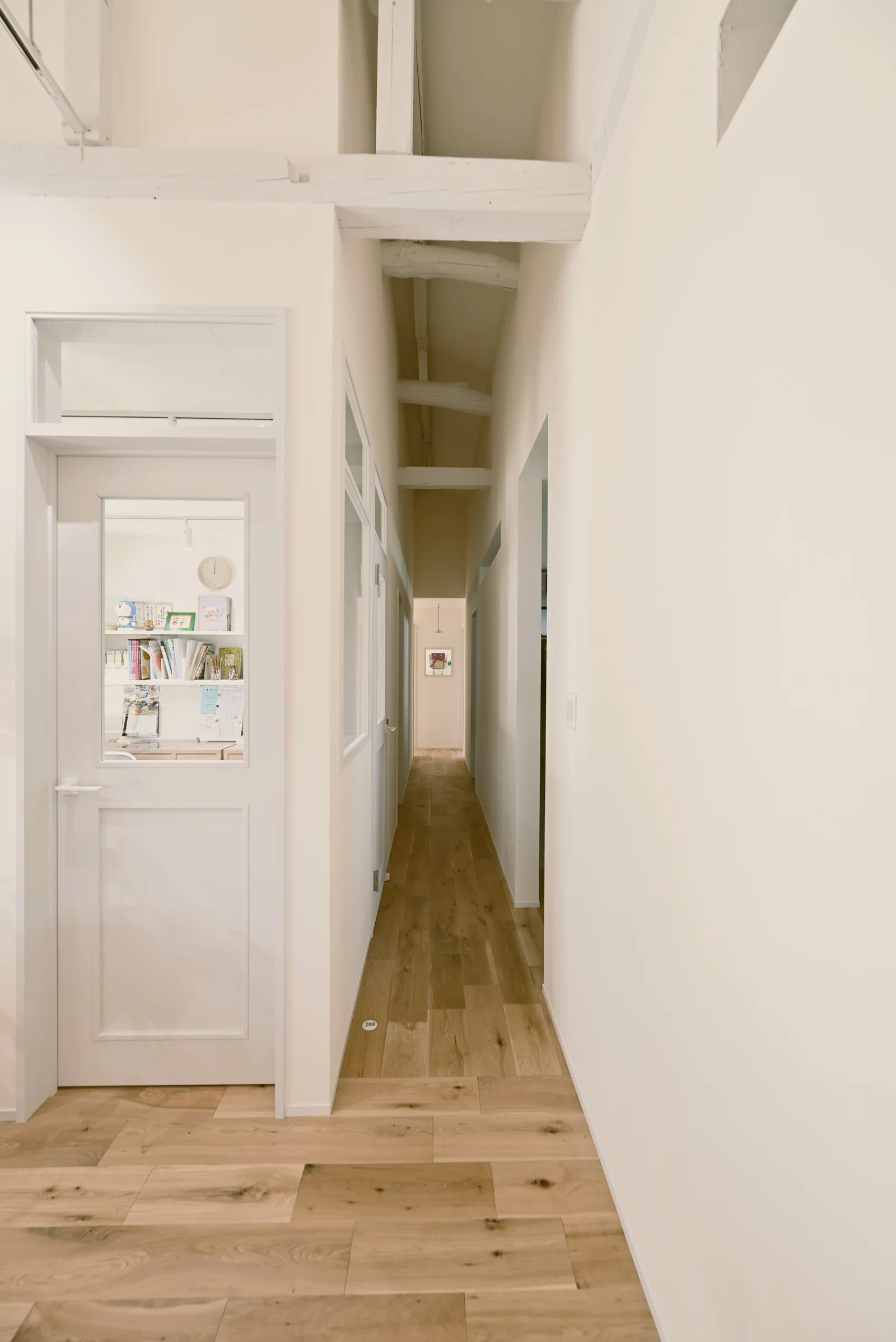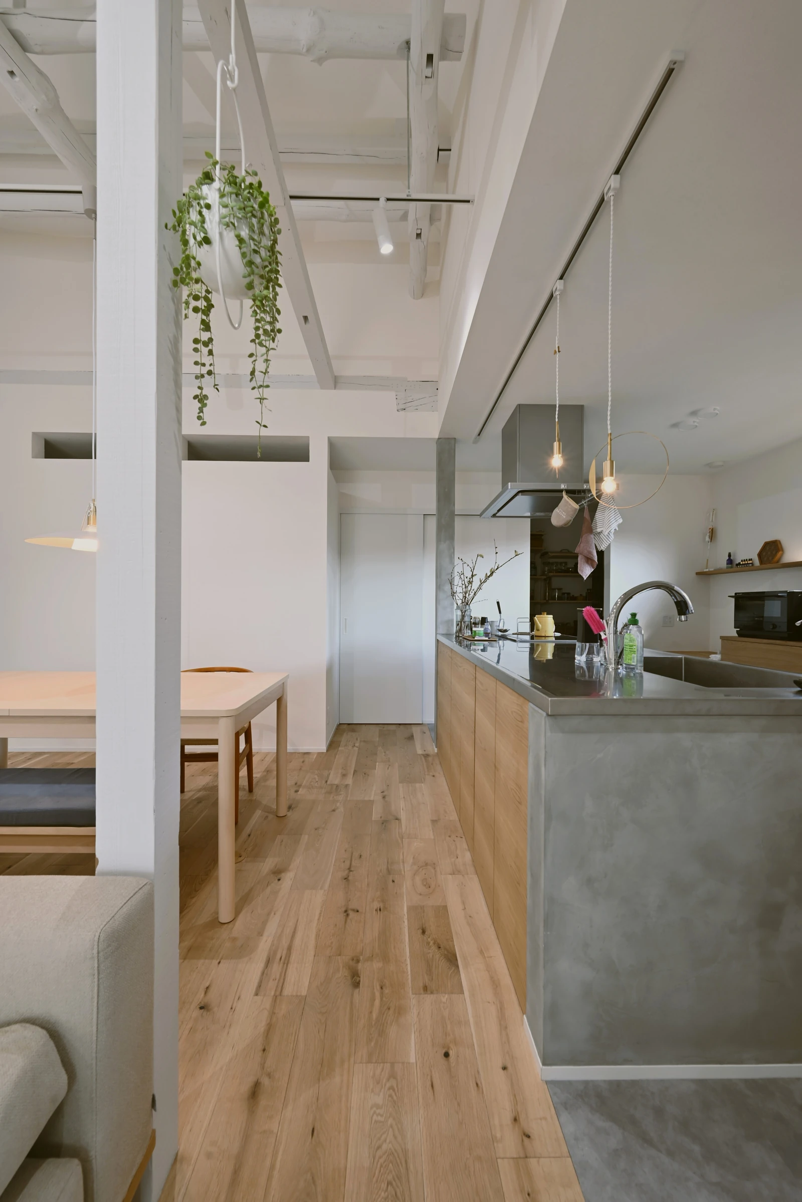 白い壁と高い天井が、開放感と明るさを生み出し、黒いフレームのドアが印象的で空間を引き締めています。床や梁、家具などに木が使われており、温かみのある空間になります。観葉植物を配置することで、癒やしを与えてくれます。