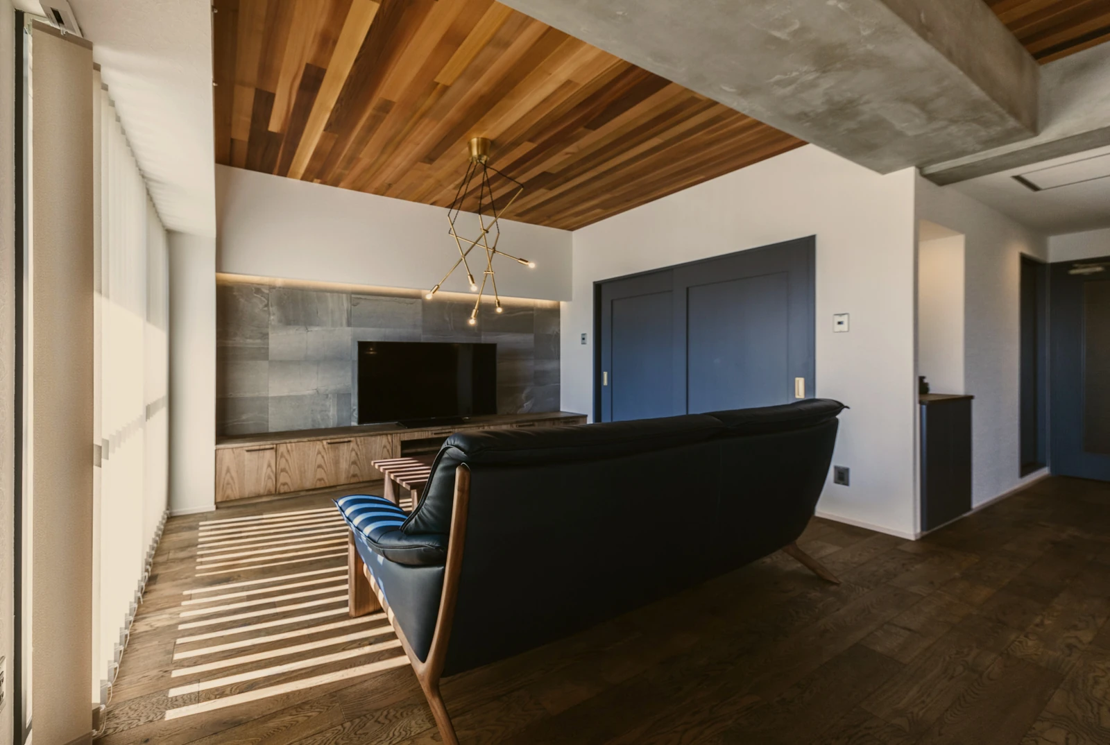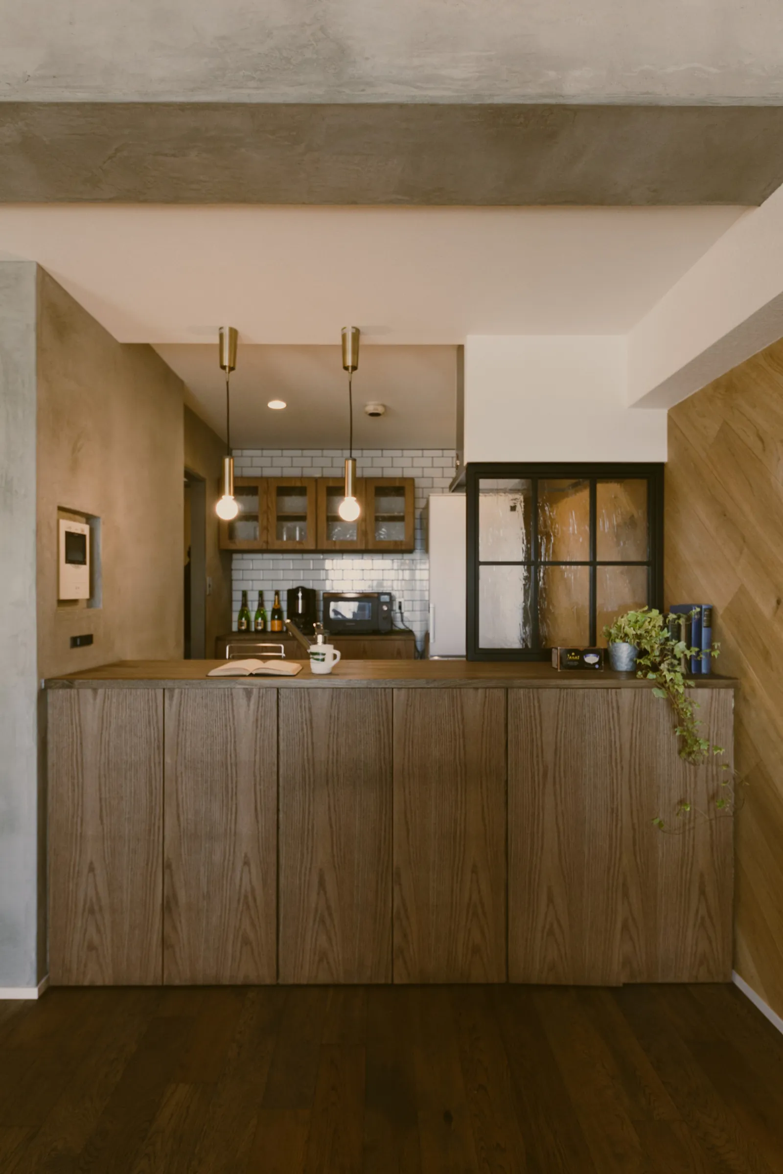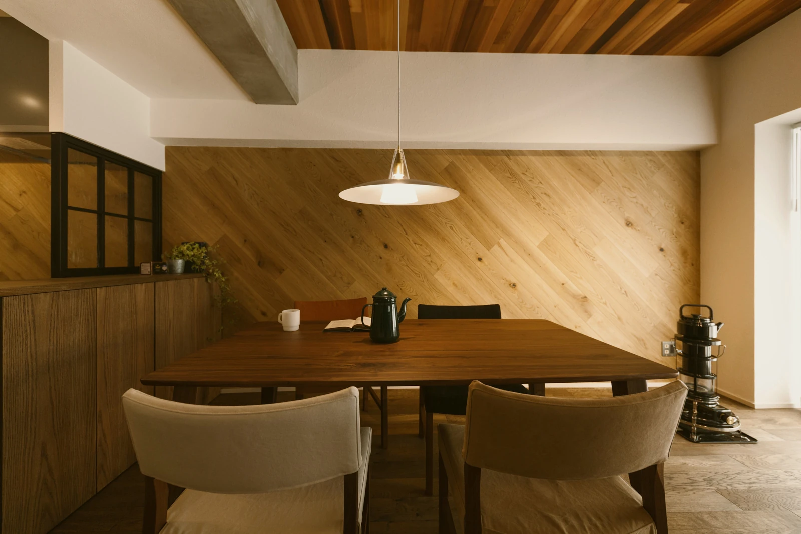 築年数を感じさせない、開放感あふれるLDKです。高い天井と木の素材が、温かみと開放感を演出しています。コンクリートと照明の組み合わせが、スタイリッシュなアクセントになっています。リビングスペースとダイニングスペースがゆるやかにつながる快適空間です。