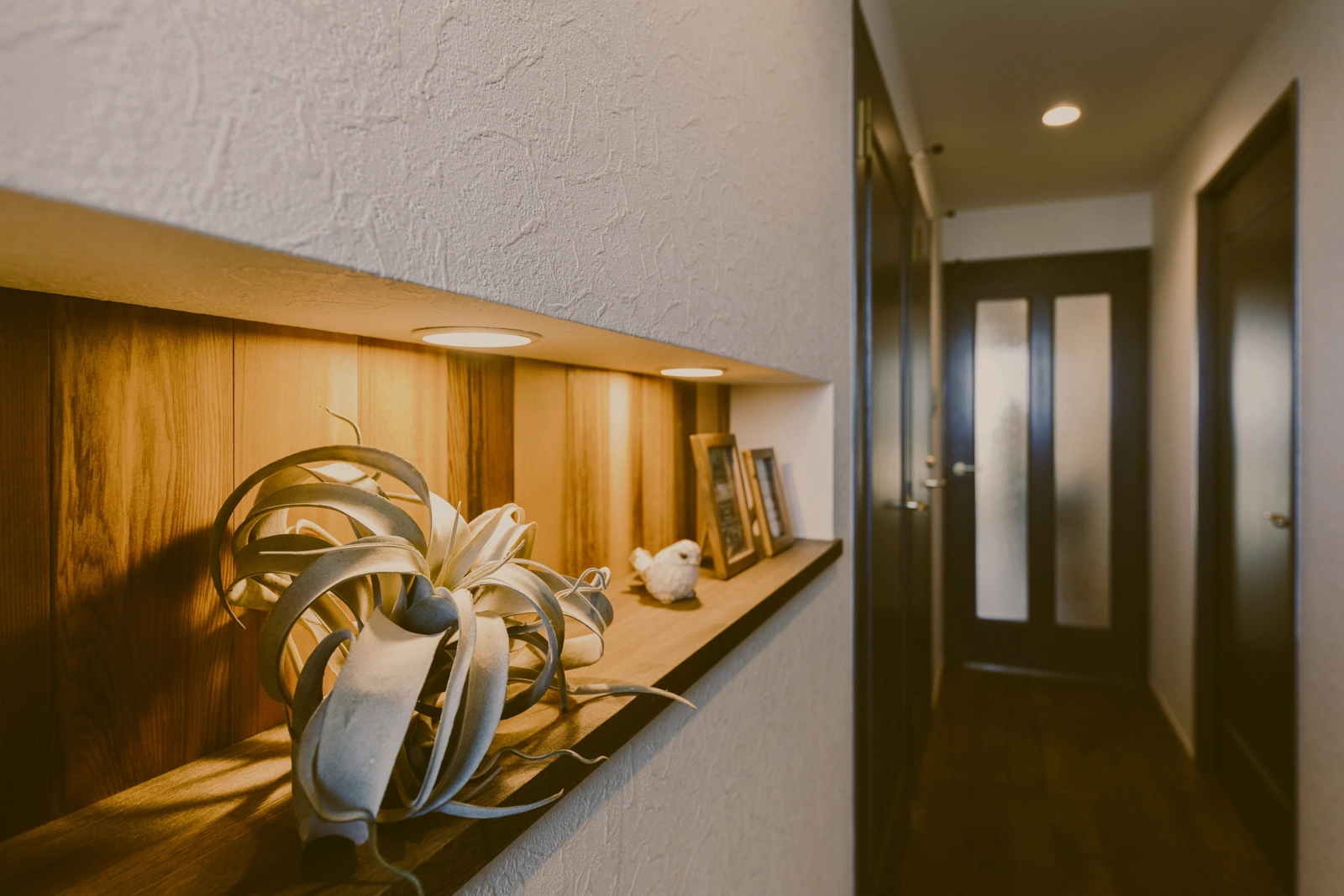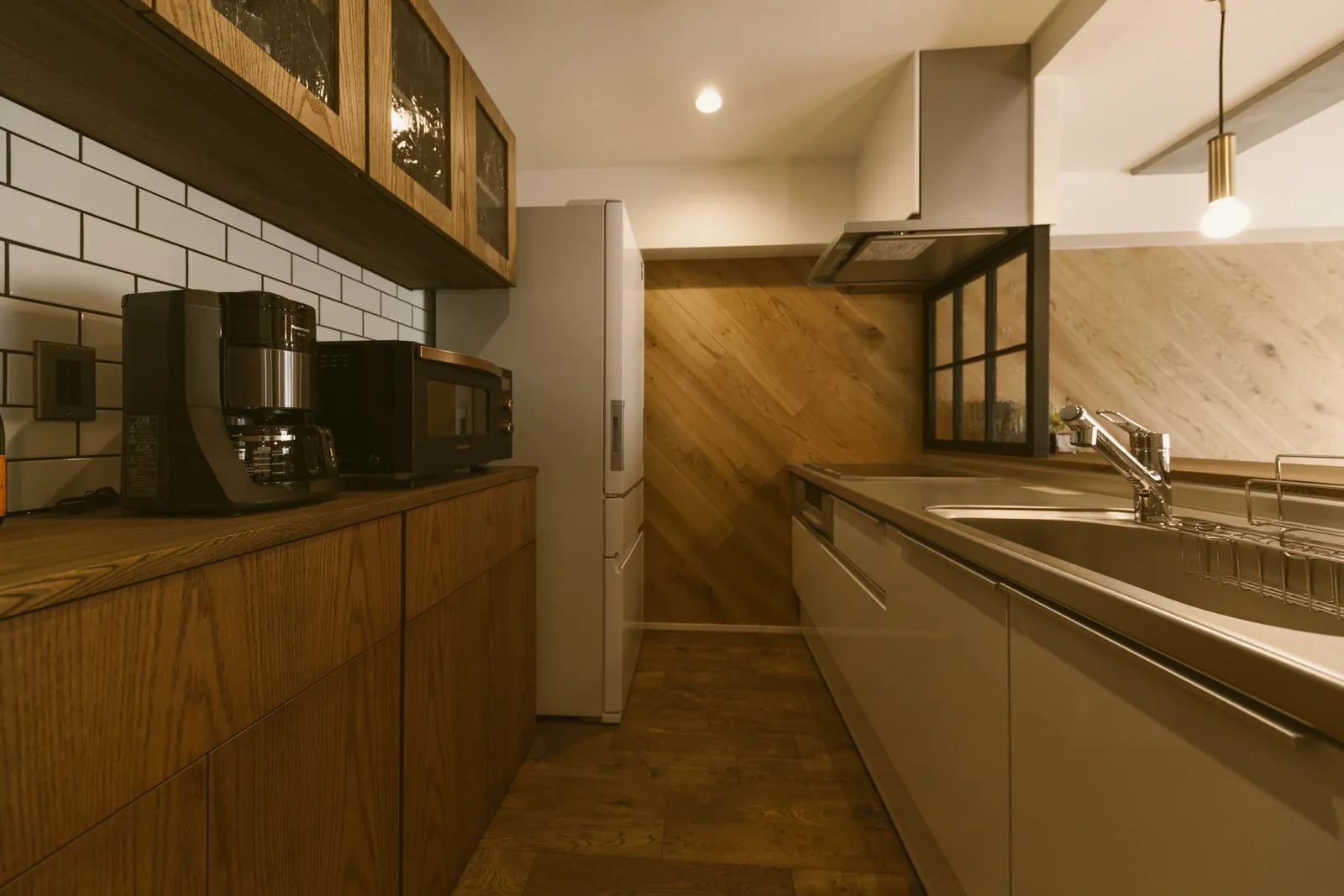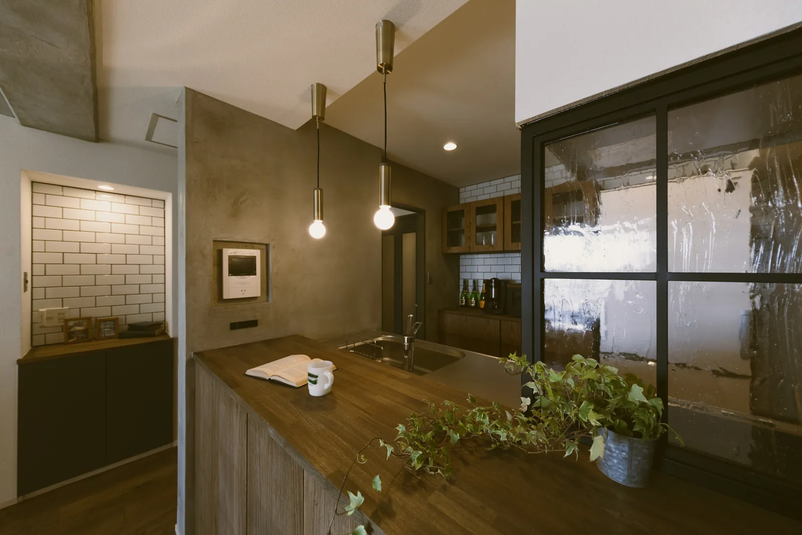 築年数を感じさせない、開放感あふれるLDKです。高い天井と木の素材が、温かみと開放感を演出しています。コンクリートと照明の組み合わせが、スタイリッシュなアクセントになっています。リビングスペースとダイニングスペースがゆるやかにつながる快適空間です。